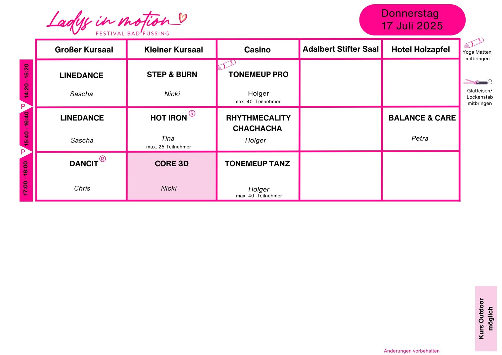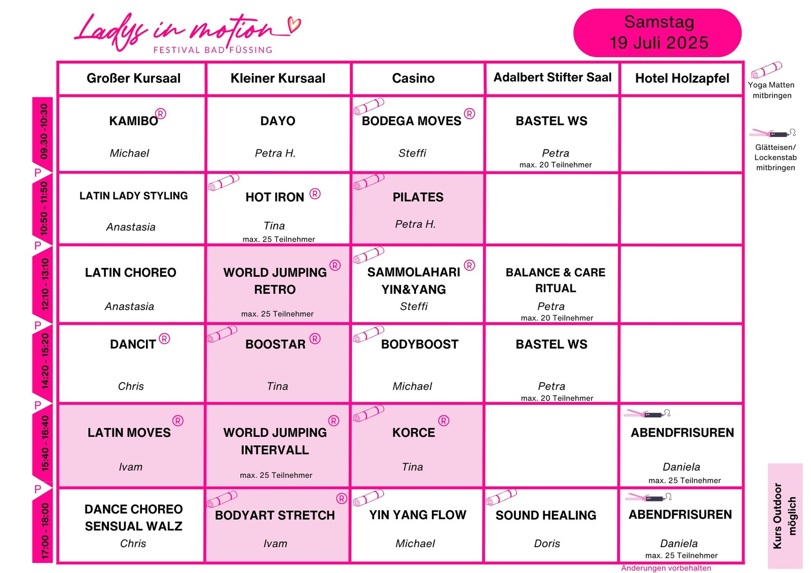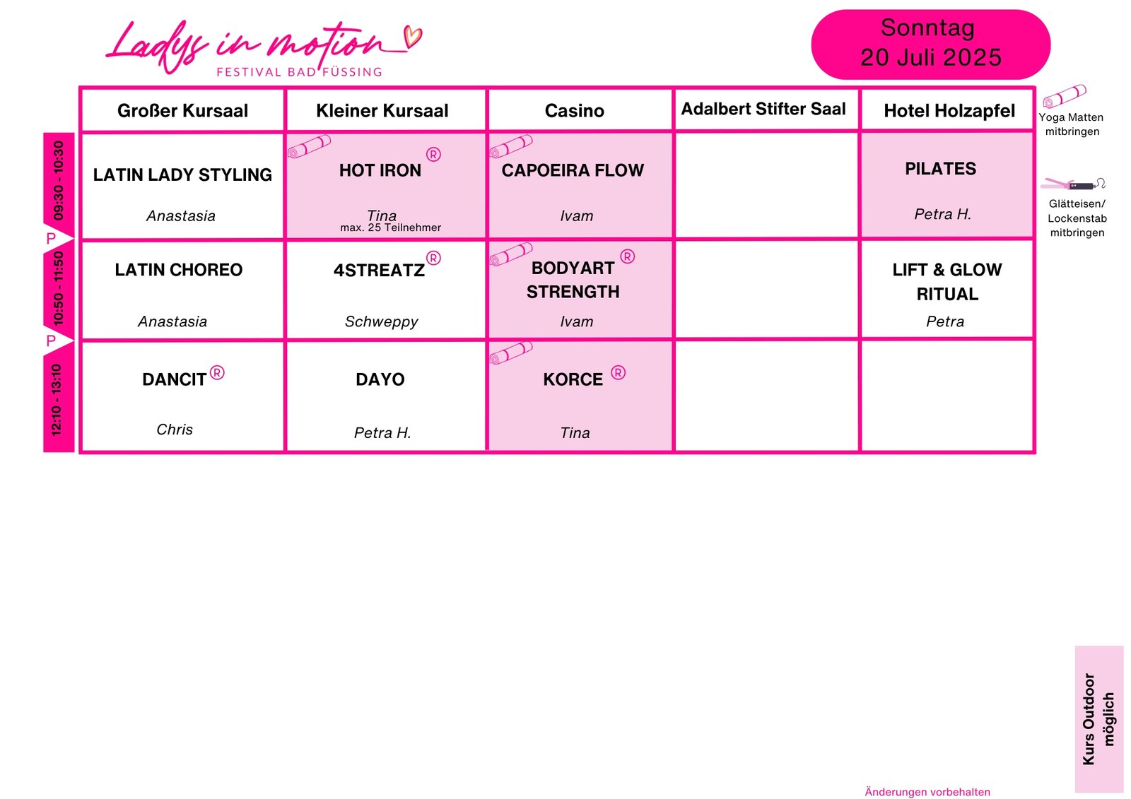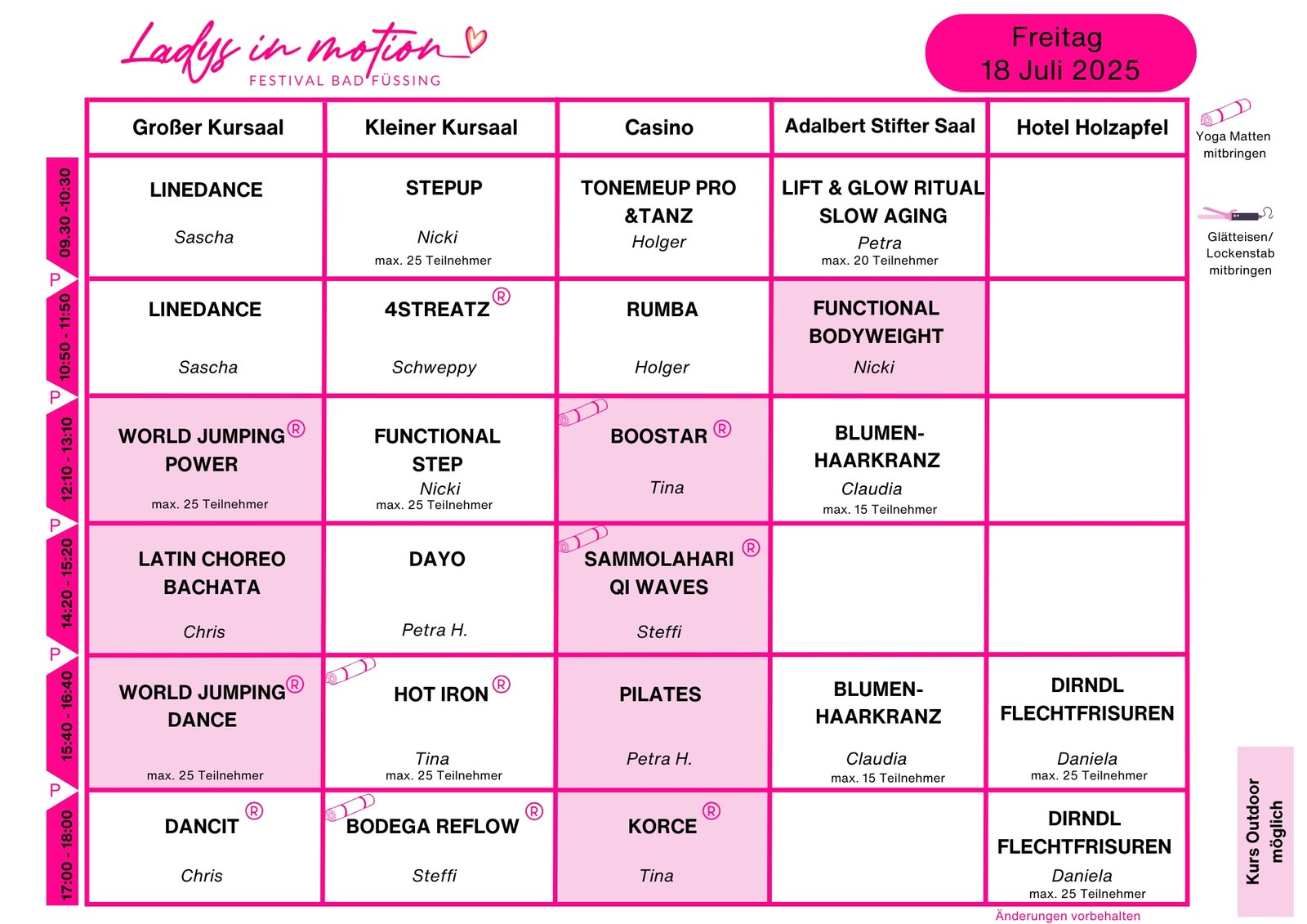 Mehr InformationenErlebe vier Tage voller Tanz, Fitness, Energie & Inspiration – beim Festival Ladys in motion vom 17.–20. Juli 2025 in Bad Füssing. Über 70 Kurse, Top-Trainer & eine Community, die dich feiert, wie du bist.
